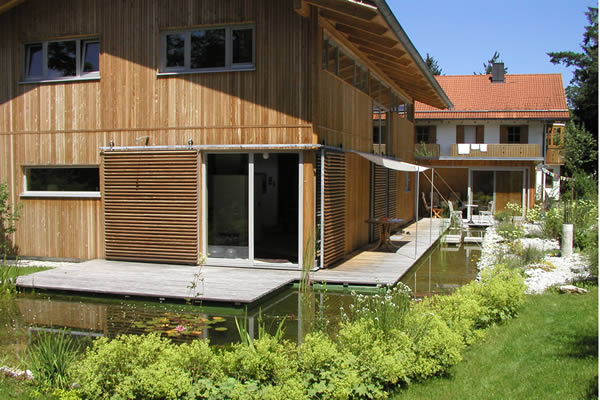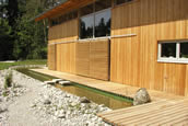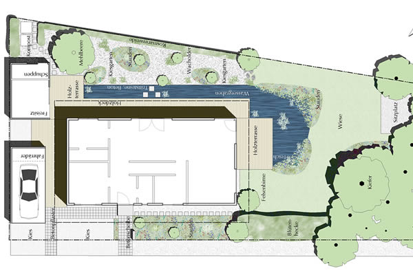 Die Holzterrasse wird von einer Wasserfläche umgeben, die im Bereich des Kiesgarten durch ihre strenge Geometrie die Form des benachbarten Kanals aufnimmt. Im Wiesengarten weitet sich der Graben zu einem großzügigen Teich auf.